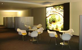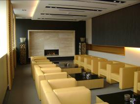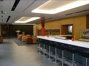 Das Designkonzept entwickelte das Architektenteam Hollin + Radoske aus Frankfurt, die das Erschein-ungsbild der Lufthansa bereits seit 2000 entscheidend mitgeprägt haben. Dem Design für das neue QSH Seeheim lag der Gedanke des Corprate Design zu Grunde. Daher tauchen die Farben der Lufthansa in vielen Einrichtungs- elementen im gesamten Gebäude auf. Die Ausführungsplanung für den gesamten Innenausbau übernahm das bekannte Reutlinger Innenarchi-tekturbüro Markus-Diedenhofen. Sie sorgten nicht nur für die detail-genaue Gestaltung jedes der 483 Zimmer, sondern schenkten auch den öffentlichen Bereichen besondere Aufmerksamkeit. Warme Farben und natürliche Materialien laden unter anderen in der Vinothek, der Biblio-thek, dem Kaminzimmer oder der Kellerbar, aber auch in der Sauna zum Entspannen ein. Die Holzver-kleidungen im Bankettsaal sorgen nicht nur für ein harmonisches Gesamtbild sowie bessere Akustik, sondern bieten auch die Möglichkeit die für Tagungen notwendige Technik diskret unterzubringen. |