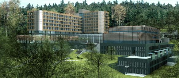Die Bilfinger Berger Hochbau AG übernahm diese anspruchsvolle Aufgabe als Generalunternehmer. Im August 2006 wurde das „alte“ Lufthansa Bildungszentrum für immer geschlossen. Im November begann dann der Abriss der Gebäude. Parallel dazu wurde ein Ideenwettbewerb zum Neubau des QSH Seeheim ausgerufen, aus dem das Büro ghp Architekten aus Oberursel als Sieger hervorgingen. Nach ihrem Entwurf sollte das neue QSH Seeheim entstehen. In der Begründung zur Wettbewerbs-entscheidung hieß es: „[Ihr] Entwurf überzeugt durch die klare Strukturierung des komplexen Gebäudes.“ Ca. 67.000 qm Grundfläche sollen, verteilt auf insgesamt 14 Etagen, alle notwendigen Funktionen aufnehmen und sich trotzdem harmonisch in die Natur des Odenwaldes einfügen. Die zwei L-förmigen Wohnkuben „wachsen”, verbunden durch das gläserne Haupttreppenhaus, aus dem mit Naturstein verkleideten Sockel des Gebäudes, der fünf Etagen tief in den Hang hineinragt. Zahlreiche Terrassen und großflächige Glasfassaden geben den Blick frei auf die Stadt Seeheim und das Umland. Am 02. Juli 2007 wurde der Grundstein für das neue Schulungs-zentrum gelegt. Knapp 10 Monate später, im Mai 2008, konnte das Richtfest gefeiert werden. Und mit dem Aufzug des Richtkranzes wurde auch der Endspurt für den Neubau eingeläutet. Da der Rohbau weitgehend fertig gestellt war, sollte der nächste und sicherlich anspruchvollste Bauabschnitt begonnen werden - der Innenausbau.